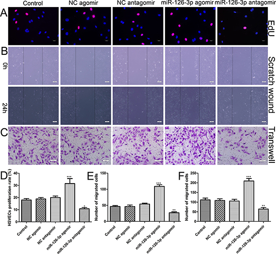 Figure 2: Effect of miR-126-3p on the proliferation and migration of HSVECs. HSVECs were transfected with 100 nmol miR-126-3p agomir and antagomir. (A) Representative images of the EdU incorporation assay of HSVECs. EdU-positive cells were red-stained, and negative cells had blue nuclei (Hoechst 33342). Scale bars represent 20 μm. (B) Representative images of cell migration after scratching in miR-126-3p agomir-transfected HSVECs. Scale bars represent 200 μm. (C) Representative images of the transwell assay of in miR-126-3p agomir-treated HSVECs. Scale bars represent 100 μm. (D) Quantification of proliferation rates (percentage of EdU-positive cells) of HSVECs. (E) The numbers of cells that migrated to the wound zones of the scratch wound assay were quantified. (F) The mean number of migrated cells was quantified. The results are presented as the mean ± SEM from 3 independent experiments. *P < 0.05; **P < 0.01; ***P < 0.001 vs control.