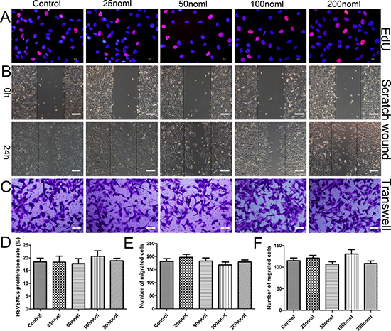 Figure 4: miR-126-3p agomir had no effect on HSVSMC proliferation and migration in vitro. (A) Representative images of the EdU incorporation assay of HSVSMCs treated with 25, 50, 100 or 200 nmol miR-126-3p agomir. EdU-positive cells were red-stained, and negative cells had blue nuclei (Hoechst 33342). Scale bars represent 20 μm. (B) Representative images of cell migration after scratching in miR-126-3p agomir-transfected HSVSMCs. Scale bars represent 200 μm. (C) Representative images of the transwell assay of miR-126-3p agomir-treated HSVSMCs. Scale bars represent 100 μm. (D) Quantification of the proliferation rates (percentage of EdU-positive cells) of HSVSMCs. (E) The numbers of cells that migrated to the wound zones of the scratch wound assay were quantified. (F) The mean of number of migrated cells was quantified.