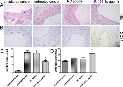 Figure 5: Effect of the miR-126-3p agomir on the human saphenous vein organ culture model. (A) Representative HE stained cross-sections of HSV segments after 14 days of culturing ex vivo. (B) Representative CD31 immunohistochemical staining cross-sections of HSV segments after 14 days of culturing ex vivo. (C) Quantification of the neointimal thickness of independently cultured HSVs. (D) Quantification of the ratio of the CD31 length to lumen perimeter in sections of independently cultured saphenous veins. Scale bars represent 100 μm. Values are expressed as the mean ± SEM. n = 6. #P < 0.001 vs uncultured vein, *P < 0.01 vs NC agomir-treated and miR-126-3p agomir-treated veins.