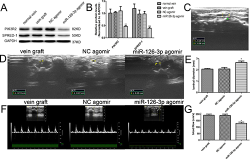 Figure 6: Exogenous miR-126-3p improved blood flow in vein grafts in vivo. (A) Representative western blots and quantification (B) of PIK3R2 and SPRED-1 proteins are shown. PIK3R2 and SPRED-1 protein levels were significantly downregulated by local delivery of the miR-126-3p agomir at 7 days after transfection. (C) The vein grafts were all patent during the whole observation period, and longitudinal imaging emphasizes the internal diameter of the cannula and the vein graft at 4 weeks after surgery. (D) Representative ultrasound images and quantification (E) of the luminal diameter in vein grafts at 28 days after surgery are shown. (F) Representative ultrasound images and quantification (G) of the peak systolic velocity in vein grafts at 28 days after surgery are shown. Values are expressed as the mean ± SEM. n = 3–6 per group. *P < 0.05, **P < 0.01 vs NC agomir and vein graft groups.