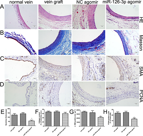 Histomorphometric analysis was performed at 4 weeks after venous implantation (Figure 7A–7D). Hematoxylin eosin staining revealed that treatment with miR-126-3p agomir dramatically reduced neointimal thickness, whereas treatment with NC agomir and no treatment resulted in a dramatically increased neointima (56.83 ± 9.99 μm vs 141.7 ± 13.12 μm and 127.3 ± 16.64 μm, respectively, P both < 0.01, Figure 7A and 7E). These results were consistent with the findings obtained for cultured HSVs ex vivo. To gain further insights into the observations mentioned above, we performed histochemistry for collagen by Masson trichrome staining (Figure 7B) and immunohistochemistry for SMCs using α-SMA antibodies (Figure 7C). The Masson trichrome staining showed that the percentage of neointimal area occupied by blue-colored fibers (collagen) did not obviously differ between the miR-126-3p agomir-treated group and the other control groups (P > 0.05, Figure 7F). Moreover, immunohistochemical staining of α-SMA demonstrated the presence of abundant SMCs localized in the neointima in vein grafts, and the accumulation of positively stained SMCs was markedly reduced in vein grafts treated with miR-126-3p agomir (22160 ± 2271 mm2 vs 33832 ± 4735 mm2 and 35468 ± 1803 mm2, respectively, P both < 0.05, Figure 7G). Moreover, we also conducted staining with proliferating cell nuclear antigen (PCNA) to identify vascular proliferating SMCs after venous implantation. Consequently, almost no expression of PCNA protein was detected in the normal vein, but PCNA-positive cells were prominent in the neointima of arterialized veins (Figure 7D). Importantly, compared with the NC agomir group and the vein graft group, a significant reduction in PCNA-positive cells could be induced in the neointima after local delivery with miR-126-3p agomir (13.17 ± 1.64% vs. 24.83 ± 2.26% and 23.67 ± 2.35%, respectively, P < 0.01, Figure 7H).
