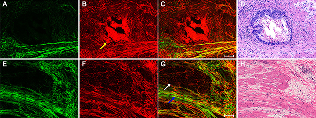Figure 1: The top row shows the nonlinear optical images of normal muscularis and corresponding H&E-stained image. (A) SHG image (color-coded green); (B) TPEF image (color-coded red); (C) merging of SHG and TPEF images; and (D) H&E image. The bottom row shows the nonlinear optical images of cancerous muscle tissue and corresponding H&E-stained image: (E) SHG image; (F) TPEF image; (G) merging of SHG and TPEF images; and (H) H&E-stained image. Scale bar: 100 μm.