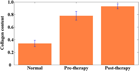 Collagen content was also calculated to quantify stromal collagen changes. Quantitative results shown in Figure 4 reveal that collagen content in the normal muscular tissue was 0.34 ± 0.05, whereas in the pretherapy and posttherapy muscular tissues, collagen content was 0.78 ± 0.07 and 0.93 ± 0.04, respectively. Highly significant differences existed between any two sample groups (P < 0.001). These results indicate that the pretherapy and posttherapy muscular tissues may contain more collagen fibers because of the desmoplastic response caused by tumor invasion and the fibrotic response induced by neoadjuvant therapy, respectively. Therefore, collagen content may be treated as an optical biomarker to discriminate between normal and abnormal tissues.