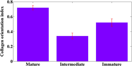 Figure 7: Collagen orientation index in mature, intermediate, and immature stroma. P < 0.001 was obtained between any two sample groups. Error bars indicate standard deviation.