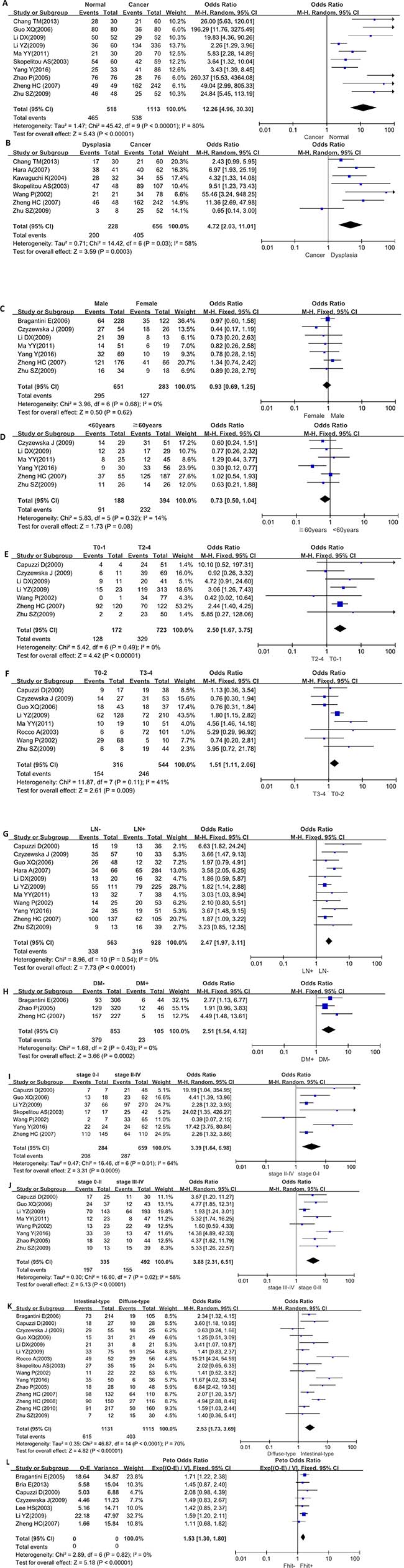 The transcription deletion of FHIT was detectable in intrahepatic cholangiocellular carcinomas induced by N-nitrosobis (2-oxopropyl) amine in female Syrian golden hamsters [11]. FHIT-deficient mice easily developed forestomach tumors and invasive bladder carcinoma after the treatment with N-nitrosomethylbenzylamine and N-butyl-N- (4-hydroxybutyl) nitrosamine respectively [12, 13]. BBN(N-butyl-N-(-4-hydroxybutyl)- nitrosamine)-induced urinary bladder cancer could be prevented in FHIT knock-out mouse by Rofecoxib, a cox-2 inhibitor [14]. Lung cancer susceptibility in FHIT-deficient mice was increased by Vhl haploinsufficiency [15]. Fujishita et al. [16] found that FHIT knockout mice developed tumors in the lymphoid tissue, liver, uterus, testis, forestomach and small intestine. In the present study, we performed a meta- and bioinformatics analysis to clarify the clinicopathological and prognostic significances of FHIT expression in gastric cancer at both mRNA and protein levels.