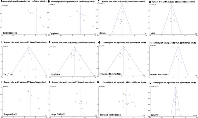Here, our meta-analysis showed FHIT expression was inversely linked to depth of invasion, lymph node metastasis, distant metastasis and TNM staging of gastric cancer, indicating that its hypoexpression promoted invasion and metastasis of gastric cancer, in agreement with the reports about oral squamous cell carcinoma [55], cholangiocarcinoma [56], colorectal cancer [57], and cervical cancer [58]. FHIT promoter hypermethylation was positively linked to tumor staging, pathological grade, or lymph node metastasis of colorectal cancer [59], thyroid cancer [49] and lung cancer [60]. Chen et al. [61] found that FHIT mRNA expression had an inverse relation with larger invasive range, poor histological differentiation and advanced clinical stage of nasopharyngeal carcinoma. Yin et al. [54] reported that homozygous deletion of exon 5 of FHIT was positively associated with lymph node metastasis of differentiated thyroid cancer and the homozygous deletion of exon 8 was positively associated with the tumor pathological grade, TNM staging, and lymph node metastasis of differentiated thyroid cancer. Taken together, we concluded that FHIT loss might be employed as a potential biomarker for aggressiveness of gastric cancer.