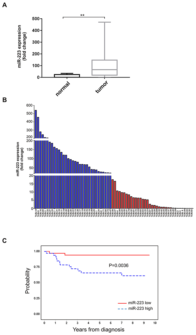 Figure 1: Expression levels of miR-223 in T-LBL patients. (A) Boxplot of differential miR-223 expression in T-LBL tumour biopsies (n=67) and in normal thymus tissue (n=5) detected by qRT-PCR (**P=0.003). Data have been calculated according to the comparative delta Ct method (2-ΔΔCt), using RNU6 as endogenous control. The horizontal line in the box indicates the median expression level of miR-223. (B) Heterogeneous expression levels of miR-223 in 67 T-LBL cases. Data have been measured by qRT-PCR according to the comparative delta Ct method (2-ΔΔCt), and compared to normal thymus tissue. Blue and red bars are T-LBL tumor biopsies with higher (> median value) and lower (≤ median value) level of miR-223, respectively. MiR-223 median expression level=18. (C) PFS according to miR-223 expression level. MiR-223 high (>median value), miR-223 low (≤median value).