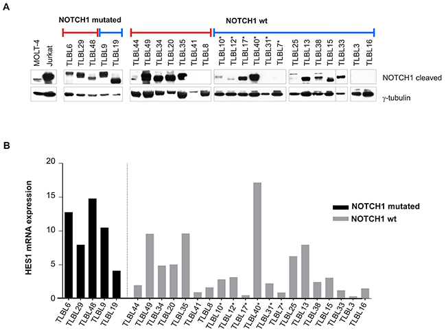 Figure 2: NOTCH1 pathway activation in T-LBL primary tumors. (A) Western blotting analysis of intracellular cleaved NOTCH1 in T-LBL tumour biopsies. Blue line: patients with miR-223 high expression level; red line: patients with miR-223 low expression level. Lysates from cell lines MOLT-4 and Jurkat were included as positive controls. γ-tubulin was used as loading control. Vertical lines have been inserted to indicate repositioned gel lanes. (B) Expression levels of HES1 mRNA in primary tumors measured by qRT-PCR. Data have been calculated according to the comparative delta Ct method (2-ΔΔCt), using ABL gene as endogenous control. Relapsed patients are indicated with *.