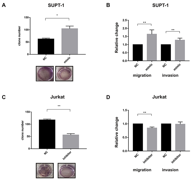 Figure 4: miR-223 involvement in tumor cell growth, migration and invasion. SUPT-1 cells that express low levels of miR-223 were transiently transfected with miR-223 precursor (mimic) or its negative control (NC) and used to analyze clonogenicity (A) or migration and invasion (B). Conversely, Jurkat cells, that expresses high level of miR-223, were transiently transfected with inhibitor (anti-miR or anti-control) and used to analyze clonogenicity (C) or migration and invasion (D). The results are shown as number of colonies measured at 10 days by colony assay (A-C), and percentage (%) of migration and invasion by Transwell-migrating or Matrigel-invading cells (B-D). Clonogenicity, migration and invasion of miR-modulated cells are shown relative to negative control values. Two or three independent experiments were performed in triplicate and mean results are shown. *P<0.05; **P<0.001.
