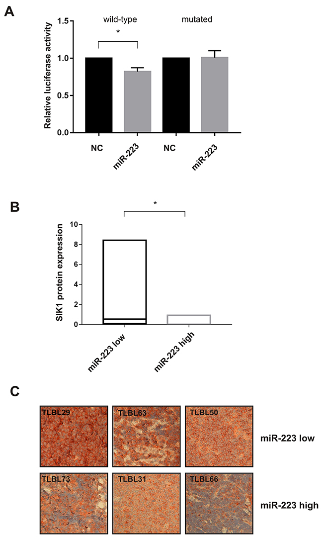 Figure 5: miR-223 modulates the expression of SIK1. SUPT-1 cells transfected with miR-223 precursor analyzed 24 h post-transfection were used to perform Luciferase assay in cells transfected with reporter containing wild-type or mutant (mutated) binding sites in SIK1 3’-UTRs. Results from three independent experiments are shown as mean ± SEM of Firefly luciferase activity relative to controls (NC), normalized on Renilla luciferase activity. *P<0.05, (A). Boxplot represents the analysis of SIK1 protein expression in T-LBL tumour biopsies detected by immunoblotting. Density expression level was normalized on tubulin. The horizontal line in the box indicates the median expression level of SIK1 in the two miR-223 subgroups (miR-223-low and -high) of T-LBL cases. *P<0.05 (B). SIK1 staining in T-LBL specimens, belong to miR-223-low (T-LBL_29,63,50) and -high groups (T-LBL_73,66,31) (× 40) (C).
