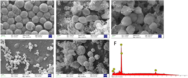 Figure 1: Representative of SEM images and EDS results. SEM images of the HGNPs (A). SEM images of licochalcone A/hollow gold nanoparticles at 0.25mg/mg (B), 0.50mg/mg (C), 1.00mg/mg (D), 2.00mg/mg (E). EDS pattern of the hollow nanostructures (F).