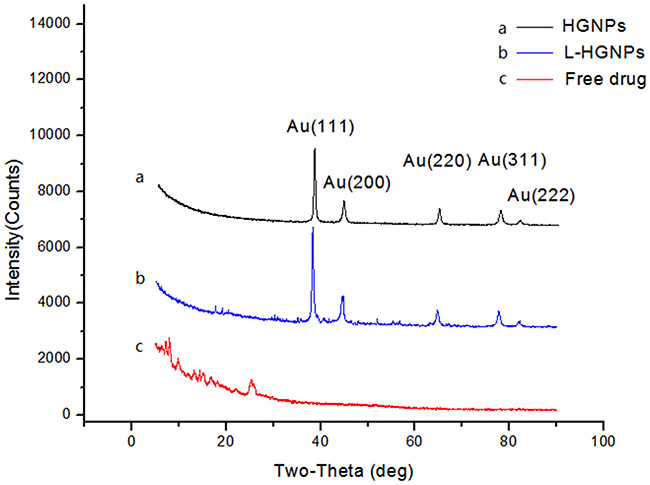 The crystal state of HGNPs, L-HGNPs and free licochalcone A were further confirmed by X-ray diffraction (Figure 2). The diffraction pattern for the HGNPs have five peaks at 38.18 °, 44.45 °, 64.64 °, 77.62 ° and 81.77 °, corresponding to the (111), (200), (220), (311) and (222) planes of the face centered cubic structure of gold [37], respectively (same as JCPDS 04-0784). Notably, the entirely different results between free drugs and L-HGNPs indicated that licochalcone A had lost its crystal state and integrated with gold nanoparticles.