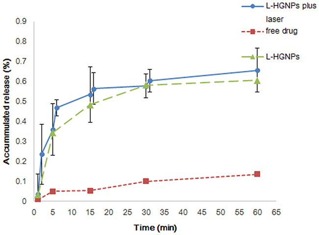 Figure 4: Dissolution profiles of free drugs and L-HGNPs with and without NIR laser irradiation. The ratio of licochalcone A/HGNPs is 0.5mg/mg. At the designed intervals (1, 5, 15, 30, 60 min), the concentration of licochalcone A in the dissolution medium was analyzed by HPLC. In L-HGNPs plus laser group, the outpower of NIR light was 2 W for 1 min and then analyzed the concentration of licochalcone A at 1, 2, 5, 6, 15, 16, 30, 31, 60 min. The value of L-HGNPs with and without NIR laser irradiation were expressed as mean ± standard deviation (n = 3).