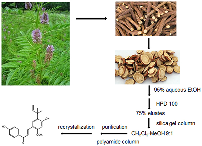 The air-dried G.inflata, (10.0 kg) were extracted with 95% EtOH (160 L) under reflux for 2 h. After evaporation of the EtOH extracts in vacuo, the resultant residues (1.8 kg) were suspended in water and subjected to macroporous resin (HPD 100) to elute sequentially with H2O, 75%, 95%EtOH, respectively. The 75% eluates (120 g) were chromatographed on silica gel column (1000 mm×100 mm i.d.) using a gradient CH2Cl2-MeOH system and polyamide column chromatography with MeOH-H2O system as mobile phase, respectively. The licochalcone A was finally isolated from the fraction MeOH-H2O at 6:4 after recrystallization (Figure 5).