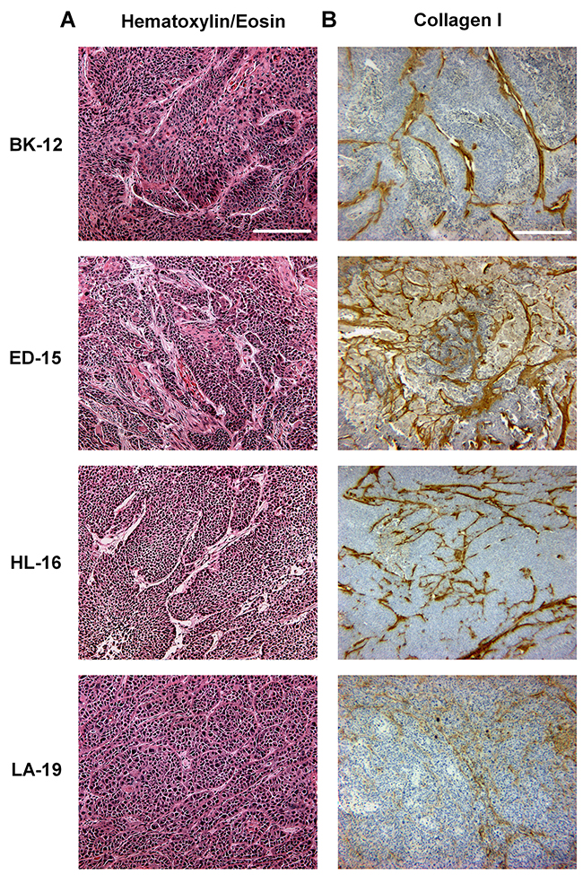 Figure 1: Histological appearance of BK-12, ED-15, HL-16, and LA-19 xenografts. (A) Tumor preparations stained with hematoxylin and eosin. Scale bar: 200 μm. (B) Tumor preparations immunostained for collagen I. Scale bar: 500 μm.