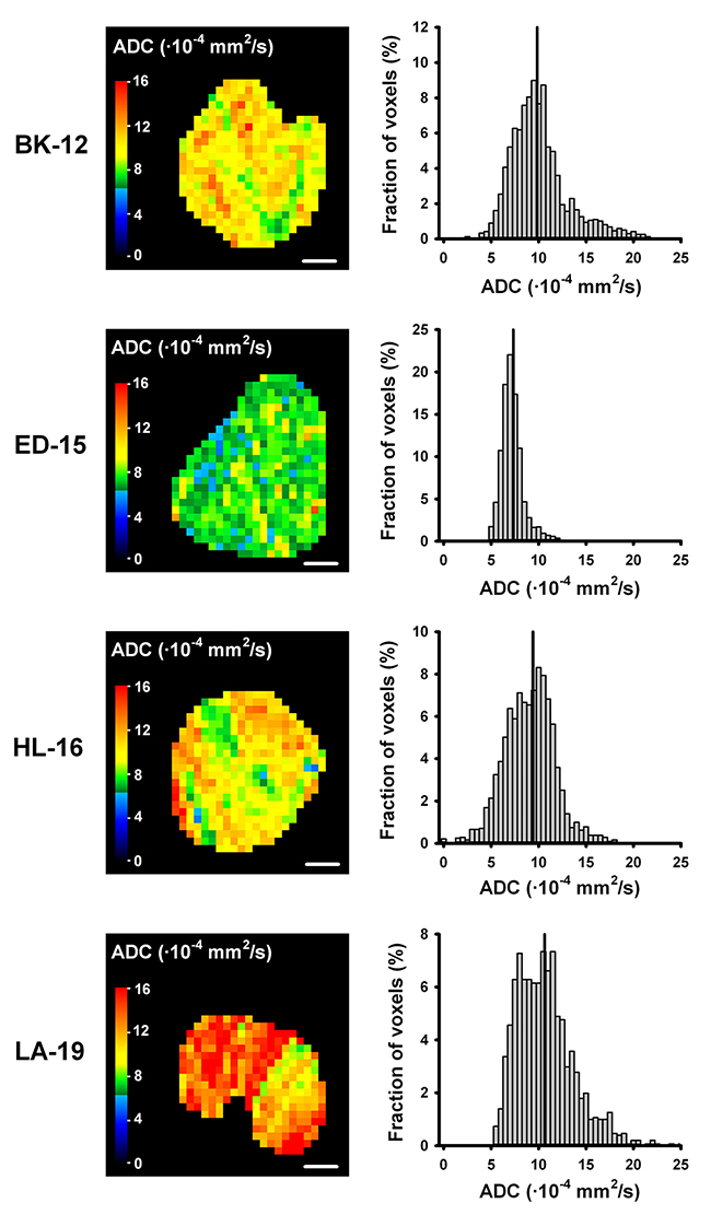 Figure 2: ADC maps and parameter distributions. ADC images and frequency distributions of a representative BK-12, ED-15, HL-16, and LA-19 tumor. ADC maps display a central axial tumor section, while frequency distributions include voxel values from the whole tumor. Tumor median values are indicated by vertical lines. Color bars: ADC scales. Scale bars: 2 mm.