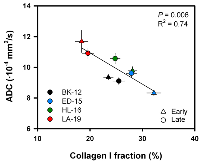 Figure 3: ADC versus collagen I fraction. Median ADC plotted as a function of collagen I fraction for early generation (triangles) and late generation (dots) tumors of each PDX model. Symbols: mean values ± SEM of 10–28 tumors. Curve: linear regression line.