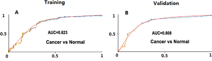 We then used combination strategies to search for the combined lipid molecules who can meet the criteria described above. We finally determined a panel of four lipid species, including LPE (18:1), ePE(40:4), C(18:2)CE and SM(22:0), as candidate biomarkers for early detection of NSCLC disease at the training stage (Table 3). LPE (18:1) and ePE(40:4) showed significant increase of concentration in NSCLC cases as compared to normal controls, while C(18:2)CE and SM(22:0) showed decreases (Table 3). The predictive power of this lipid panel in diagnosis of early stage NSCLC was shown with Area Under Curve (AUC) of 82.3%, sensitivity of 81.9% and specificity of 70.7% at the training stage (Table 4 and Figure 1A) that 105 cases and 80 normal individuals were analyzed.