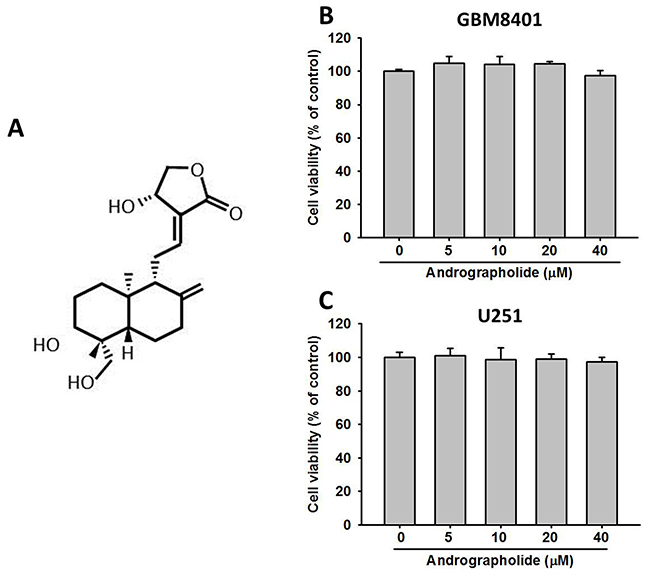 Figure 1: Effects of andrographolide on cell viability. (A) Structure of andrographolide. Cell viability of (B) GBM8401 cells and (C) U251 cells cultured in presence of andrographolide (0-40 μM) for 24 h, as analyzed by MTT assay. Results are shown as mean ± SE from 3 determinations per condition repeated 3 times.