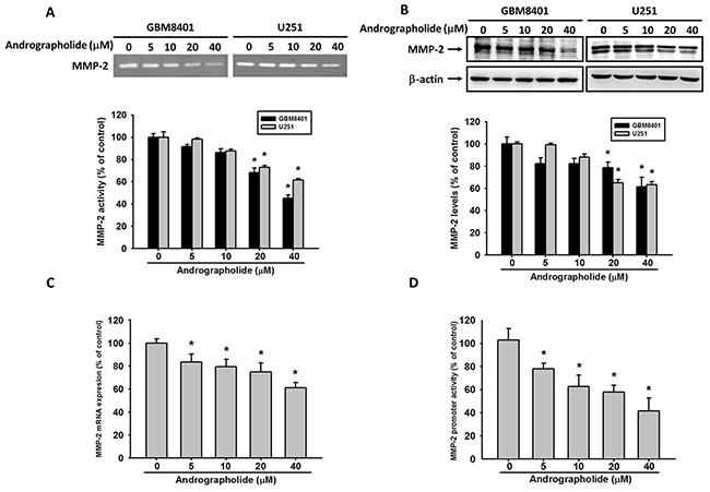 Figure 3: Andrographolide inhibit MMP-2 activity, protein and mRNA expression. (A) GBM8401 cells and U251 cells were treated with andrographolide (0-40 μM) for 24 h in serum free medium and then subjected to gelatin zymography to analyze the activity of MMP-2. (B) Western blotting to analyze the protein levels of MMP-2. Quantitative results of MMP-2 protein levels after being adjusted with β-actin. The values represented the means ± SE from 3 determinations per condition repeated 3 times. (C) GBM8401 cells were treated with andrographolide (0-40 μM) for 24 h and then subjected to real-time PCR to analyze the mRNA expression of MMP-2. (D) MMP-2 promoter reporter assay to analyze the promoter activity of MMP-2. Luciferase activity, determined in triplicates, was normalized to β-galactosidase activity. The values represented the means ± SE from 3 determinations per condition repeated 3 times (n=3). *Significantly different, p < 0.05, compared with the vehicle group.