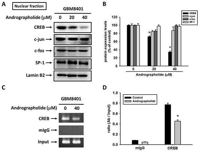 Figure 4: Critical role of CREB in andrographolide-induced transcriptional inhibition of MMP-2 in GBM8401 cells. (A-B) GBM8401 cells were treated with andrographolide (0-40 μM) for 24 h and then the nuclear fraction was prepared as described in Materials and Methods. Representative results of CREB, c-jun, c-fos and SP-1 by Western blot analysis. (C-D) ChIP analysis of the association of CREB transcription factors with the MMP-2 promoter region in GBM8401 cells. The values represented the means ± SE from 3 determinations per condition repeated 3 times (n=3). *Significantly different, p < 0.05, compared with the vehicle group.
