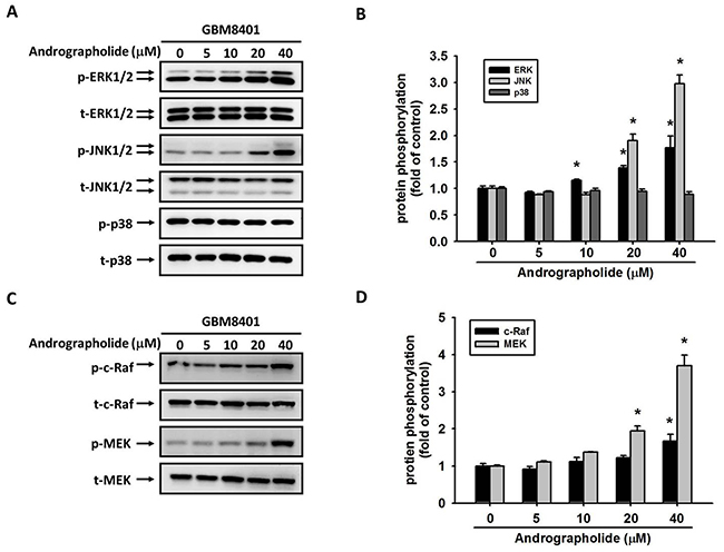 Figure 5: Effect of andrographolide on MAPK pathway in GBM8401 cells. GBM8401 cells were treated with andrographolide (0-40 μM) for 24 h and then the cell lysates were subjected to SDS-PAGE followed by western blots with (A) anti-ERK1/2, anti-JNK, anti-p38, (C) anti-c-Raf and anti-MEK antibodies as described in Materials and Methods. (B, D) Quantitative results the phosphorylation levels of ERK1/2, JNK, p38, c-Raf and MEK. *Significantly different, p < 0.05, compared with the vehicle group.