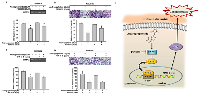 Figure 6: Effects of MEK inhibitor (PD98059), JNK inhibitor (JNK-in-8) and andrographolide on MMP-2 activity and cell migration of GBM8401 cells. GBM8401 cells were pre-treated with PD98059 (25 μM) for 30 min, and then incubated in the presence or absence of andrographolide (20 μM) for 24 h. (A) The culture media were used as subjects for analysis of MMP-2 activity. (B) The cells were used for migration assay as described in the Materials and Methods section. (C-D) GBM8401 cells were pre-treated with JNK-in-8 (1 μM) for 30 min, and then incubated in the presence or absence of andrographolide (20 μM) for 24 h. (C) The culture media were used as subjects for analysis of MMP-2 activity. (D) The cells were used for migration assay as described in the Materials and Methods section. The values represented the means ± SD of at least three independent experiments. *p<0.05 as compared with the control. #Significantly different, p<0.05, when compared with andrographolide-treated group. (E) A working model showing the ability of andrographolide to regulate the invasive ability of GBM8401 cells.