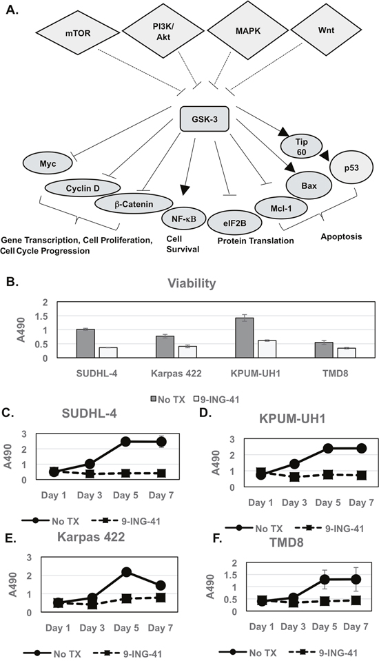 Figure 1: Viability and proliferation of lymphoma cells with 9-ING-41 treatment. (A) Schematic representing GSK-3 up-stream regulators and down-stream targets and their role in cellular processes in cells. It should be noted that several of the target proteins are misregulated in cancer cells. Only target proteins relevant for this paper are shown for simplicity. (B-F) 10,000 cells (SUDHL-4, KPUM-UH1, Karpas 422, TMD8) per 96-well plate well were left untreated or treated with 1μM 9-ING-41 in triplicate, and the number of cells on days 1, 3, 5 and 7 were calculated using the MTS assay. Briefly, 20μL of MTS reagent was added to cells and incubated for 2 hours and, the absorbance at 490 nm (A490) was read using a Biotek plate reader. Error bars represent std. deviation between replicates. Day 3 viability is shown in B.