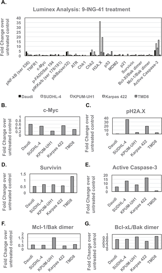 Figure 2: Luminex signaling analysis of lymphoma cells treated with 9-ING-41 (Related to Table 1). (A) 1 million cells were left untreated or treated with 1μM 9-ING-41 for 48 hrs and were then lysed in Millipore MAP lysis buffer. After protein concentration determination via BCA, an equal amount of protein around 10-15 μg (depending on the kit) of protein was used for luminex analysis. Samples were run in duplicates and according to manufacturer instructions. After setting the net MFI or absolute quantity of untreated control to 1 for each analyte, the fold change with 9-ING-41 treatment was calculated (>1 is an increase in levels, <1 is a decrease in levels). Analytes that show significant changes are shown as individual panels. (B) c-Myc, (C) pH2A.X, (D) Survivin, (E) Active Caspase 3, (F) Mcl-1/Bak Dimer, (G) Bcl-Xl/Bak dimer.
