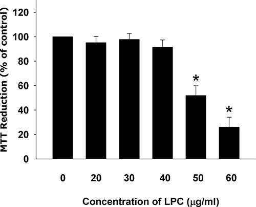 Figure 1: Cytotoxicity of LPC to endothelial cells as analyzed by MTT. Results were expressed as Mean ± SE. *denotes statistically significant difference (p < 0.05) when compared with solvent control.