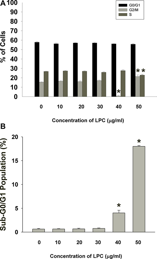 Figure 2: PI fluorescence of EAHY cells after exposure to different concentrations of LPC (10-50 mg/ml). (A) EAHY cell populations residing in G0/G1, S, and G2/M after exposure to LPC, (B) Sub G0/G1 population of EAHY cells after exposure to LPC. Results were expressed as Mean ± SE. *indicates statistically significant difference when compared with solvent control-treated group.
