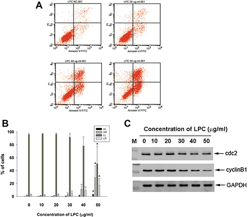 Figure 3: Effect of LPC on apoptosis of EAHY endothelial cells as analyzed by PI and annexin V dual fluorescent flow cytometry. (A) One representative flow cytometry picture was shown. (B) Quantitative analysis of PI + annexin V flow cytometric analysis. *denotes statistically significant difference (p < 0.05) when compared with control (C) Effect of LPC on cdc2, and cyclin B1 protein expression of EAHY cells. One representative western blot picture was shown. Expression of GAPDH was used as control.
