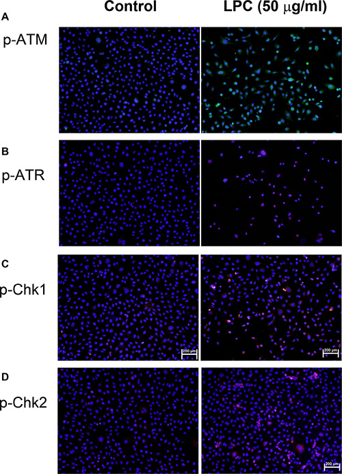 Figure 4: Induction of p-ATM, p-ATR, p-Chk1, and p-Chk2 expression by LPC to endothelial cells. EAHY endothelial cells were exposed to different concentrations of LPC. Immunofluorescent (IF) microscopic observation was utilized to determine the expression of (A) p-ATM, (B) p-ATR, (C) p-Chk1, and (D) p-Chk2 in endothelial cells. One representative IF picture was shown. (blue – DAPI, green – p-ATM, red – p-ATR, p-Chk1, or p-Chk2).