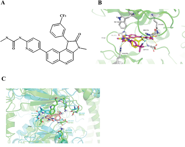 Figure 1: (A) Chemical structure of SHR8443. (B) The binding modes of BEZ235 and SHR8443 with PI3Kα. The protein was represented as a ribbon diagram (green); SHR8443 (yellow) and BEZ235 (magenta), as well as residues that interacted with these compounds, were shown in stick form. Hydrogen bonds were shown as dashed lines (SHR8443, yellow; BEZ235, cyan) between heavy atoms. (C) The binding mode of SHR8443 within mTOR. SHR8443 was represented by wheat-colored sticks; mTOR and PI3Kα were shown as cyan and green ribbon diagrams, respectively. The key residues of mTOR and PI3kα were shown as sticks. Hydrogen bonds were shown as dashed lines (yellow) between heavy atoms.