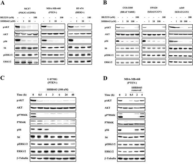 Figure 2: Effects of SHR8443 on PI3K/mTOR signaling in cancer cell lines with different genetic backgrounds. (A) Breast cancer cell lines (MCF7, BT-474 and MDA-MB-468) and (B) KRAS or BRAF mutated cell lines (COLO205, SW620 and A549) were treated with increasing concentrations of SHR8443 or 100 nM BEZ235 for 3 h. (C) U-87MG cells were treated with 100 nM SHR8443 for the indicated time. (D) Reversibility of PI3K/mTOR signaling. MDA-MB-468 cells were treated with 100 nM SHR8443 for 2 h, with or without further culture in drug-free medium for the indicated time after washing with PBS. Whole-cell lysates were analyzed by Western blotting using the indicated antibodies.