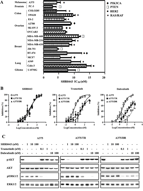 Figure 3: Cell profile of SHR8443 cytotoxicity. (A) Anti-proliferative activity of SHR8443 against a panel of cancer cell lines with different tissues of origin and genetic backgrounds. Tumor cell lines harboring a PIK3CA mutation (♦), HER2 amplification (●), PTEN deficiency (⬜), or RAS/RAF mutation (*) were treated with different concentrations of SHR8443 for 72 h. Cell viability was determined by SRB assay. IC50 values were presented as means ± SD of three independent experiments. (B) Melanoma cell lines A375, A375/TR (trametinib-resistant), and A375/DR (dabrafenib-resistant) were treated with different concentrations of SHR8443, dabrafenib, or trametinib for 72 h. Cell viability was determined by SRB assay. (C) Melanoma cell lines A375, A375/TR and A375/DR were treated with SHR8443, dabrafenib or trametinib for 2 h. Whole-cell lysates were analyzed by Western blotting using the indicated antibodies.