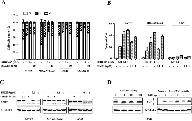 Figure 4: SHR8443 causes cell cycle arrest, autophagy, and apoptosis. (A) Cell-cycle phase histograms of MCF7, MDA-MB-468, COLO205 and A549 cell lines following treatment with SHR8443 or BEZ235 at the indicated concentration for 24 h. (B) MCF7, MDA-MB-468 and A549 cells were treated with SHR8443 or BEZ235 at the indicated concentrations for 72 h, and then analyzed by annexin V-FITC/PI staining and flow cytometry. (C) After treatment of cells with SHR8443 or BEZ235 for 72 h, whole-cell lysates were immunoblotted with an anti-PARP antibody. (D) A549 cells were treated with SHR8443 (left), BEZ235, or the combination of SHR8443/BEZ235 (100 nM) with E64d/pep (10 mg/mL) for 48 h. Whole-cell lysates were analyzed by immunoblotting with an anti-LC3 antibody.