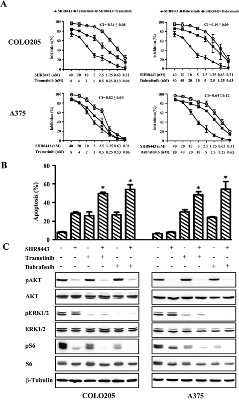Figure 5: Combined treatment of BRAF mutant A375 and COLO205 cells with SHR8443 and dabrafenib or trametinib. (A) A375 and COLO205 cells were incubated with the indicated concentrations of each compound or their combinations for 72 h. Cell viability was determined by SRB assay. CI, combination index. (B) A375 and COLO205 cells were incubated with SHR8443 (100 nM), trametinib (10 nM), dabrafenib (100 nM), or their combinations for 72 h, and analyzed by annexin V-FITC/PI staining and flow cytometry. *P < 0.05, versus either single agent treatment. (C) A375 and COLO205 cells were incubated with SHR8443 (100 nM), trametinib (10 nM), dabrafenib (100 nM), or their combinations for 2 h. Whole-cell lysates were analyzed by Western blotting using the indicated antibodies.