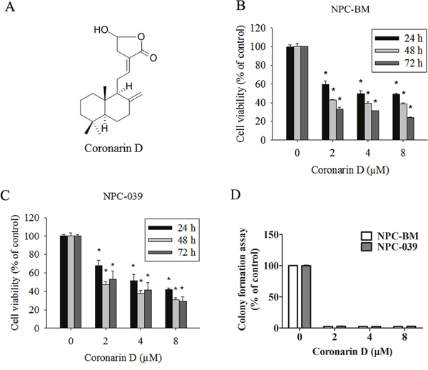 Figure 1: The dose- and time-dependent effects of Coronarin D (CD) on cell viability in human nasopharyngeal carcinoma (NPC) cells. (A) Chemical structure of CD. (B) NPC-BM and (C) NPC-039 cells were treated with the indicated concentrations of CD (0-8 μM) for 24, 48 and 72 h. Cell viability was measured by MTT assay. (D) NPC-BM and NPC-039 cells cultured in condition medium presence of CD (0–8 μM) for 14 days, as analyzed by colony formation assay. Results are shown as mean ±SEM. from at least three independent experiments. *P < 0.05, compared with the control (0 μM).