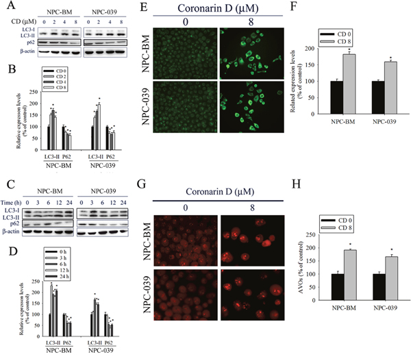 Figure 3: CD induces autophagy in NPC-BM and NPC-039 cells. (A) Cells were treated with increasing concentration of CD (0-8 μM) for 24 h and the expression levels of LC3-I/LC3-II and p62 were examined by Western blot. (B) Bar graphs represent the relative density of each band normalized to β-actin. (C) Cells were incubated with CD (8 μM) for the indicated time intervals and the expression levels of LC3-I/LC3-II and p62 were examined by Western blot. (D) Bar graphs represent the relative density of each band normalized to β-actin. (E and F) Cells were treated with or without CD (8 μM) for 24 h, and then cells were stained with MDC fluorescent dye. MDC-stained cells were observed under a fluorescence microscope, which is an indicator of autophagosome formation. (G and H) Cells were treated with or without CD (8 μM) for 24 h, and then cells were stained with acridine orange (AO) for acidic vesicular organelles (AVOs) formation which was examined under a fluorescence microscope. The amount of AVOs (orange-red fluorescence) can be used as a marker of autophagosomes. Results are shown as mean ± SEM. *P<0.05, compared with the control (0 μM).