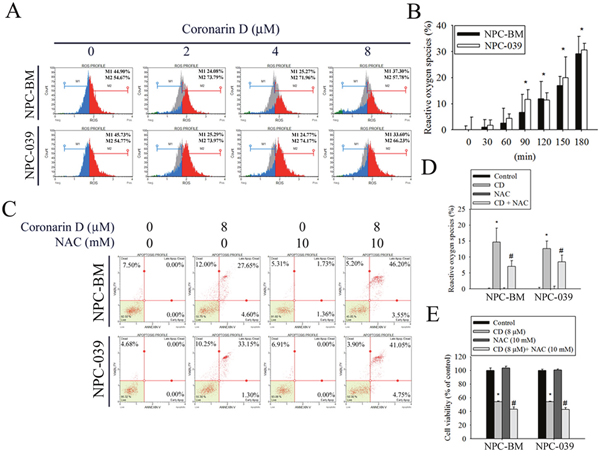 Figure 4: CD increases the generation of intracellular reactive oxygen species (ROS) to modulate cell death in NPC-BM and NPC-039 cells. The amount of intracellular ROS was assessed using a DCFH-DA fluorescent probe and a flow cytometry. The green DCF fluorescence reflects intracellular ROS production. (A) Following treatment of cells with indicated concentrations of CD (0-8 μM) for 24 h, intracellular ROS generation was detected by flow cytometry using DCFH-DA staining. M1: negative control peak; M2: DCFH positive peak. (B) Percentage of green DCF fluorescence positive cells over total number of cells were calculated following 30, 60, 90, 120, 150, and 180 min exposure of 8 μM CD. (C-E) Cells were pretreated with or without 10 mM N-acetyl-L-cysteine (NAC; ROS scavenger) for 4 h, and then treated with or without 8 μM CD for 24 h. For quantitative analysis of apoptosis, cells were dual-labeled with PI and Annexin V fluorescence and analyzed by Muse Cell Analyzer flow cytometry (C). The scavenging ability of NAC for CD-induced ROS production was evaluated by percentage of green DCF fluorescence (D). Cell viability was determined by MTT assay (E). Data are representative of at least three independent experiments. Results are shown as mean ± SEM. *P < 0.05, compared with the control (0 μM). #P < 0.05, compared with cells treated with CD (8 μM).