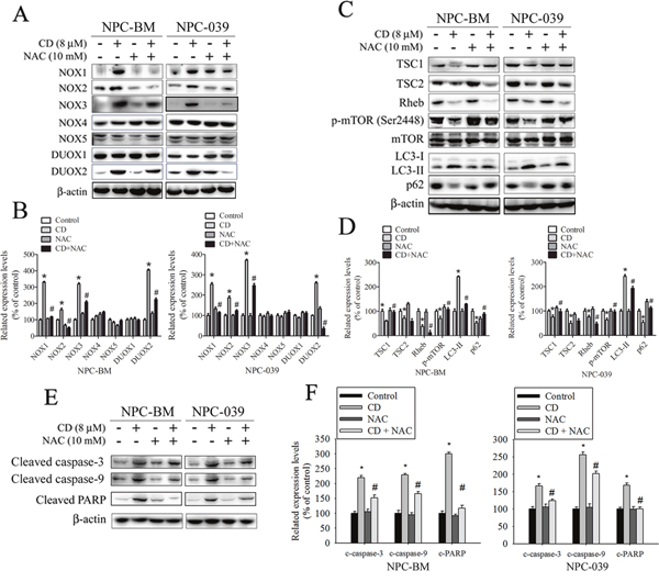 Figure 5: ROS is involved in CD-induced changes in expression of certain NOX/DUOX isoforms and modulation of TSC/Rheb/mTOR signaling axis to regulate autophagy and apoptosis in NPC-BM and NPC-039 cells. Cells were pretreated with or without 10 mM NAC for 4 h, and then cultured with or without CD (8 μM) for 24 h. Equivalent amounts of total cell lysates were subjected to Western blot analysis. (A) NOX1, NOX2, NOX3, NOX4, NOX5, DUOX1, and DUOX2 were detected in cell lysates by Western blot. (B) The relative density of the bands was quantified by densitometry analysis. The histograms illustrate the relative expression levels after normalization to β-actin. (C) The TSC1, TSC2, Rheb, p-mTOR (Ser2448), mTOR, LC3-I, LC3-II, and p62 were analyzed by Western blot with their respective antibodies. (D) The histograms illustrate the relative expression of the indicated proteins normalized to β-actin. (E) Levels of cleaved caspase-3, cleaved caspase-9, and cleaved PARP were analyzed by Western blot. (F) The relative density of the bands is shown in the histogram. Values represent the mean ± SEM. from three determinations. *P < 0.05, compared with the control (0 μM). #P < 0.05, compared cells treated with CD (8 μM) alone.
