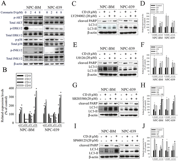 Figure 6: The effects of CD on activation of AKT and MAPKs in NPC-BM and NPC-039 cells. (A) Cells were treated with increasing concentrations of CD (0-8 μM) for 24 h. Total cell lysates were analyzed by Western blot with specific antibodies against p-AKT, AKT, p-ERK1/2, ERK1/2, p-p38, p38, p-JNK1/2, p-JNK1/2, and β-actin. (B) The intensity of the phosphorylation signals normalized against their total protein levels. The histogram illustrates the relative phosphorylation levels. (C-J) Effects of the inhibition of AKT, ERK1/2, p38, and JNK1/2 on CD-induced apoptosis and autophagy were assessed by Western blot using specific antibodies (cleaved PARP and LC3-I/LC3-II). Cells were pretreated with LY294002 (AKT inhibitor, 20 μM), U0126 (ERK1/2 inhibitor, 10 μM), SB203580 (p38 MAPK inhibitor, 10 μM), or SP600125 (JNK inhibitor, 20 μM) for 1 h followed by treatment with or without CD for 24 h. The intensity of the band signals was quantified by densitometry and normalized to β-actin. The relative expression levels are shown in the histogram (right panel). Values represent the mean ± SEM. from three determinations. *P < 0.05, compared with the control (0 μM). #P < 0.05, compared cells treated with CD (8 μM) alone.