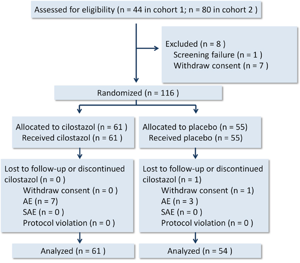 During a 1-week run-in period, 124 eligible patients were screened (44 in cohort 1 and 80 in cohort 2). Eight patients were excluded prior to randomization (7 consent withdrawal; 1 screening failure due to active malignancy). During the 12-week study period, the eligible patients were randomly assigned to receive either 200 mg cilostazol (n = 61) or placebo (n = 55) daily (Figure 1) via the unrestricted randomization method with sealed envelopes for allocation concealment. The patients, care providers, and those who administered the interventions or performed assays were all blinded after assignment to interventions. One patient in the placebo group withdrew informed consent after treatment.