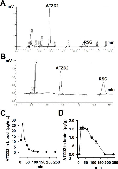 High Performance Liquid Chromatography-UV (HPLC-UV) method was used to determine the pharmacokinetic process of ATZD2 in rats. ATZD2 (25 mg/kg) was administrated by injection intraperitoneally (i.p). Orbital blood was collected at 0, 5 min, 0.25, 0.5, 1.0, 1.5, 2.0, 3.0 and 4.0 h after ATZD2 administration. The concentrations of ATZD2 in blood and brain were detected. Precusor RSG was used as the internal standard. Compound ATZD2 was separated well from internal standard RSG in blood (Figure 2A) as well as in brain (Figure 2B) using the same working system as described in the methods.