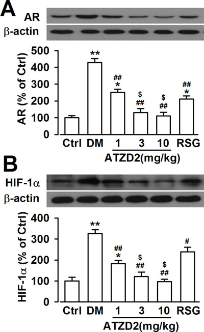 Figure 5: Effects of ATZD2 on aldose reductase (AR) and hypoxia induced factor 1α (HIF-1α) in T2DM rats. (A) Upper: Representative Western blot results showing levels of aldose reductase (AR) protein; Lower: effects of ATZD2 (1, 3, 10 mg/kg) and rosiglitazone (RSG, 3 mg/kg) on the intensity of the AR normalized to β-actin in the brain. (B) Upper: Representative Western blot results showing levels of hypoxia induced factor 1α (HIF-1α) protein; Lower: effects of ATZD2 and RSG on the intensity of the HIF-1α normalized to β-actin in the brain. n = 12 in each group, *P < 0.05, **P < 0.01 compared with the normal control group; #P < 0.05, ##P < 0.01 compared with the T2DM group; $P < 0.05 compared with the RSG-treated group.