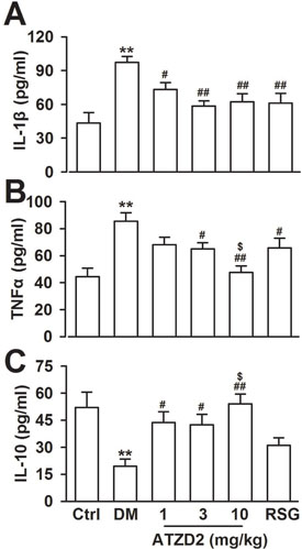 Proinflammatory cytokines TNF-α, IL-1β, and IL-6 are increased in T2DM and the accumulation of cytokines induce neuronal death by increasing apoptosis, reducing synaptic activity, and inhibiting neurogenesis, thus contribute to the impaired cognition [23]. Last, levels of inflammatory cytokines IL-1β and TNF-α and anti-inflammatory cytokine IL-10 were detected in the plasma, since inflammation is a key pathogenic factor for diabetes consequence [24]. The levels of IL-1β and TNF-α in T2DM group were increased significantly, while levels of IL-10 were decreased significantly in T2DM rats (Figure 7). Chronic administration of ATZD2 significantly decreased the levels of IL-1β (Figure 7A) and TNF-α (Figure 7B) and increased the levels of IL-10 (Figure 7C) in a dose-dependent manner. Same dose of RSG (3 mg/kg) induced a comparable effect with ATZD2.