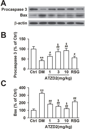 Figure 8: Effects of ATZD2 on the apoptosis in the hippocampus of diabetic rats. (A) Representative Western blot results showing levels of Procaspase-3 and Bax. (B) Effects of ATZD2 (1, 3, 10 mg/kg) and rosiglitazone (RSG, 3 mg/kg) on the intensity of the Procaspase-3 normalized to β-actin in the brain. (C) Effects of ATZD2 and RSG on the intensity of the Bax normalized to β-actin in the brain. n = 12 in each group, **P < 0.01 compared with the normal control group; #P < 0.05, ##P < 0.01 compared with the T2DM group; $P < 0.05 compared with the RSG-treated group.
