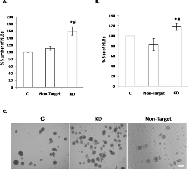 Figure 1: Effect of the Dnmt3b-KD on the NLBs cultures. (A) Effect of Dnmt3b-KD in the number of NLBs (p value KD/C = 0.0004, KD/Non-Target = 0.02). (B) Effect of Dnmt3b-KD in the size of NLBs. (C) Representative image showing the appearance of each one of the three different culture conditions (p value KD/C = 0.02, KD/Non-Target = 0.03). Scale bar 200 μm. Data are represented as mean ± SEM.