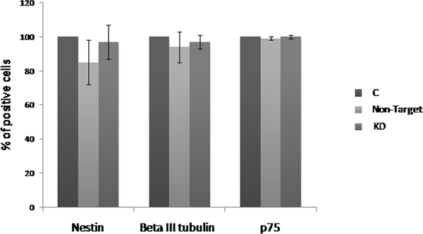 Evaluation of the Dnmt3b-KD effect on the neurogenesis was performed by flow cytometry in the NLBs cultures. With this purpose we analyzed the p75, Nestin and βlll-Tubulin markers, and observed that Non-Target and KD cultures showed a decrease of Nestin+ (15% and 3% respectively) and βlll-Tubulin+ cells (6% and 3% respectively) compared to C culture. On the other hand, p75 expression level was not different among the groups (Figure 2). The decrease detected in the number of Nestin + and βlll-Tubulin+ cells was due to the treatment with shRNA and we observed that the Dnmt3b-KD seems to counteract this effect resulting in an increase of these cell types in KD compared with Non-Target cultures. We also analyzed the double positive cells for the studied markers. Nestin+/p75+, βlll-Tubulin+/p75 and Nestin/βlll-Tubulin+ combinations were analyzed (Supplementary Figure 2). It is worthy to note that there were no statictically significant changes in cell phenotypes within the Dnmt3b-KD cultures.